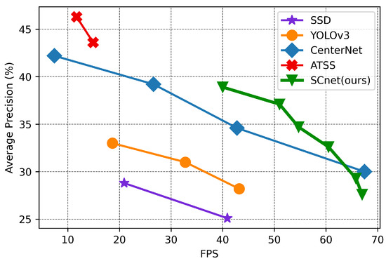 The SCNet is compared with other excellent detectors on the COCO test-dev split, and detailed results can be found in Table 4. Like other detectors, SCNet can adjust input resolution to obtain different speed-accuracy trade-off. At 608 × 608 input resolution, SCNet achieves AP of 38.9% on COCO test-dev split and outperforms most other mentioned detectors. Our detector lags behind ATSS in terms of accuracy but is faster and demands less input information. Compared with CenterNet, our detector is also superior in speed. SCNet is 0.9% lower than Mask R-CNN in terms of AP; our method runs 3.6× faster. Figure 10 shows the comparison of the proposed SCNet and several one-stage object detectors on the COCO test-dev split. The SCNet achieves a good speed-accuracy trade-off, the performance is also very close to some excellent detectors while maintaining a high inference speed.