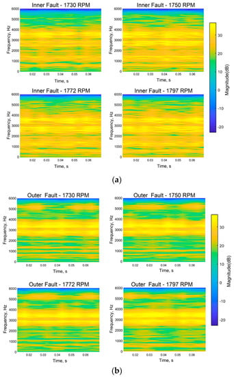 In varying working conditions of bearings (various types of single and compound faults and various degradation levels at variable rotational speeds), traditional signal processing methods such as envelope spectrum analysis and wavelet package transform are challenging to obtain meaningful information. Under these conditions, the signal’s spectrum varies greatly in amplitude and frequency. Therefore, it is troublesome to recognize the deficiencies of bearings under adverse working conditions using conventional signal processing methods. For appropriate analysis and synthesis of nonstationary signals, Short-Time Fourier Transform (STFT) is a typical Fourier transform (FT) applied to create the spectrograms of signals. The spectrogram is a visual representation of the signals in both the time and frequency domains, using a color scale of the image to indicate the frequency’s amplitude.