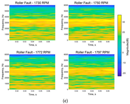 Spectrograms of bearing vibration signals at four different shaft speeds: (a) inner race bearing fault, (b) outer race bearing fault, and (c) roller fault.