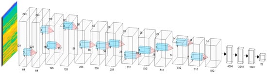 Figure 3 shows the detailed architecture of our VGG16 model fed by spectrogram images. The input size of the proposed VGG16 is fixed at 224 × 224 with 3 channels (RGB images). The input image is transmitted through the vast majority of convolution layers where the filters are applied with their receiver field which is very small: 3 × 3. In other configurations, it also uses a built-in smaller size: 1 × 1. The design of those tiny filters acts as a linear transformation of the input image channels (followed by a nonlinear transformation). The fixed size of the convolution strike is 1 pixel. The spatial padding of the input convolutional layer is preserved after convolution. Five max-pooling layers play the role of spatial pooling, which are added following convolutional layers to reduce their dimensionality. Max-pooling is performed over a 2 × 2 pixel window with a stride of 2. The following convolution layers are three fully connected (FC) layers. The first and second FC layers have 4096 neurons, and the number of neurons of the third FC layer depends on the number of different bearing faults needed to be classified (8 or 22 classes, depending on individual experiments). The final layer is the soft-max layer, which outputs a vector to show the prediction probability distribution for bearing faults. All hidden layers use rectification (ReLU) nonlinearity as an activation function [13].
