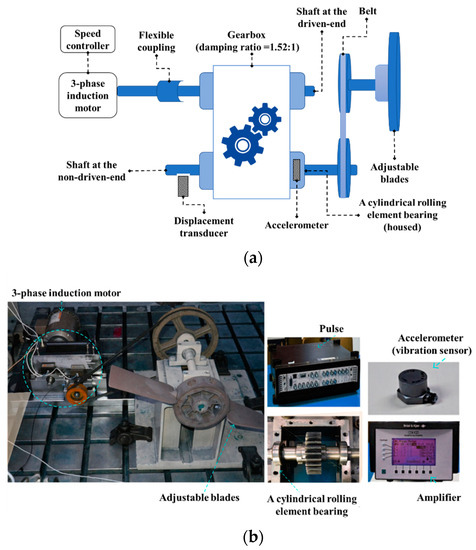 Testbed for collecting vibration signals from compound faults: (a) scheme of the experimental setup and (b) real experimental system.