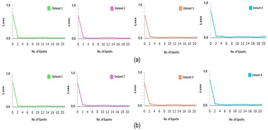 As shown in Table 4, for 4 bearing fault types (inner race bearing fault, outer race bearing fault, roller fault, and normal condition), our proposed method provides the average prediction accuracy 98.8, 99.4, 98.9, and 99.3% whereas the existing method provides the average accuracies 81.2, 81.4, 80.4, and 78.6% for datasets 1, 2, 3, and 4, respectively. Based on these results, we can know that our proposed bearing fault diagnosis method provides much higher prediction accuracy compared to the existing method for single bearing faults. Moreover, our bearing fault diagnosis method provides fast convergence ability (only 3 to 4 epochs for training), as shown in Figure 7.