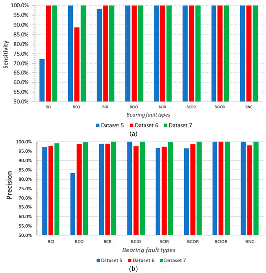 where is the number of samples from a particular class which are correctly classified and is the number of outcomes where the model incorrectly predicts the positive class. The average precisions of our proposed method for datasets 5, 6, and 7 are 96.57, 98.38, and 99.83%, respectively. The evaluated high values both in sensitivity and precision prove that the proposed method performs well in bearing fault diagnosis.