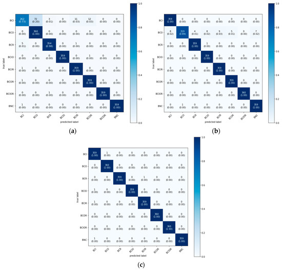 Confusion matrices showing classification results of the proposed method for (a) dataset 5, (b) dataset 6, and (c) dataset 7.