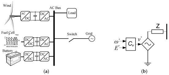 (a) Schematic representation of an islanded microgrid; and (b) the electrical model of the VSC.
