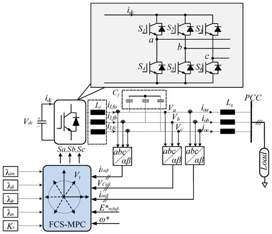 In this paper, finite control set model predictive control (FCS-MPC) is used to control a stand-alone voltage source converter in order to form a voltage reference and regulate the frequency for the future use in MGs as a grid-forming type. FCS-MPC has been discussed intensively in [11,12,13,14,15,16] for grid-connected applications and [17,18,19] provide detailed discussions on the performance of different FCS-MPC algorithms. To sum up the detailed discussion in the references mentioned above, FCS-MPC enabled simplicity and ease of including the constraints and non-linearities, and it has been proposed to be applied in many applications such as electrical drives and grid-connected power electronic systems [20,21]. Mainly, these promising results were achieved because of the general concept of FCS-MPC, which is based on the principle of using a discrete model of the power converter with an associated filter to predict its future behaviour for all possible control inputs and, consequently, apply the one that minimizes a programmed cost function (CF) at every sampling time [17] (see Figure 2). The key idea is to use the raw processing power to embed all the inner control loops within a single algorithm that takes into account the model of the converter and its associated filter. This structure provides flexibility and inherent fast response and it has been addressed in [22,23] with a focus on balancing the power in between two parallel converters. Usually, CFs based on one step prediction/short-horizon become problematic when controlling higher-order plants (as in the case of a LC filter) due to the couplings between different state variables [24]. This problem has been solved in this paper by giving respect for all orders in order to decouple each variable and control it separately without a need for more computations compared to the computational burden in the long-horizon method [25,26]. That was done by proposing a solution, which explicitly deals with the dynamic coupling between the inductor current and capacitor voltage, allowing the usage of and one step prediction/horizon for effective voltage control of the converter associated with the LC filter. Besides, the conventional FCS-MPC has a problem of variable switching frequency [27], and this has led to some difficulties in the LC filter design resulting in low converter performance due to the use of an inappropriate filter. Thereby, high power losses are introduced by including an oversized filter [28]. Therefore, many research studies have been devoted to finding a feasible solution to obtain a fixed switching operation and facilitate the filter selection process [29,30]. The paper is structured as follows: the converter model and the proposed controller are described in Section 2. In Section 3, frequency control approaches are explained in detail. In Section 4, the obtained results and remarks to them are given. Finally, the summary of the work is described in Section 5. Novelty and contributions of this research are briefly summarized as follows:
