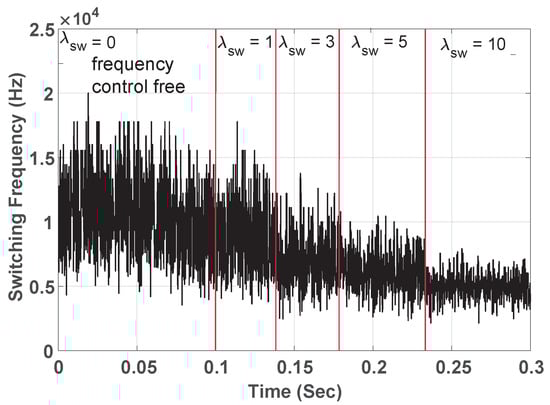 When adding Equation (21), which illustrates the simple penalization frequency control technique (SP) to the conventional or improved CFs, the switching frequency is controlled. In case the voltage or its derivative has a large error, its corresponding value in the cost function would be large enough to overcome the penalization during the switching. Thus, strong importance should be given to the penalization term by setting the value of high, then the commutation of the last step will be maintained to provide switching’s reduction. Figure 4 shows the relative importance of the penalization term with the voltage tracking term. This strategy leads to a lower average frequency and higher voltage error, as shown in Figure 5. Considering that the spectrum will still spread in a wide band range and concentrated more to the lower frequencies. Later on, in the results and discussion section, the weighting factor design for both SP-CMPC and SP-IMPC will be discussed.