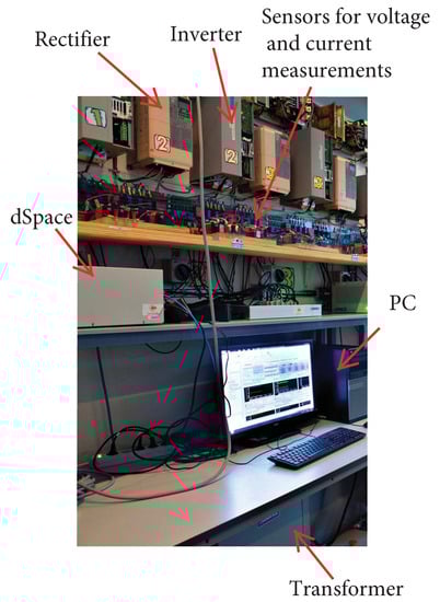 All discussed predictive control algorithms were implemented using the dSpace with DS 1007 power dual-core 2 GHz processor board. A flow chart showing the implementation steps of all algorithms can be found in Figure 6. The maximum achieved turn around time was around 22 μs. It should be noted that 9 μs was introduced by the auxiliary tasks (A/D conversion). In order to reduce the time taken by the A/D, an observer could be used to estimate the load current instead of measuring it. Since the dSpace A/D samples at a rate of 1 MS/s, that will save 3 μs from the total needed time. Moreover, the computational delay of exact Ts is compensated as discussed in [33]. The overall parameter of the test setup and simulation model can be seen in Table 1, and the setup is shown in Figure 7. Due to the setup limitation, both the simulation model and the setup have been operating at a 40 kHz sampling frequency. In order to illustrate the effect of different samplings, simulation results, in which the sampling is 80 kHz, are provided. FCS-MPCs based on the periodic, notch, penalization control algorithms have been verified experimentally, where a 5.5 kW rated power system has been built for that purpose. The power stage comprises a delta-star transformer to provide the DC-link voltage through an input filter to a rectifier. A two-level three-phase VSC (Danfoss type), the LC filter on the converter side, is loaded with a linear load. It should be noted that the Danfoss VSC contains electrolytic DC-link capacitor. In this work, the LC filter design was based on choosing low resonance frequency, as shown in Figure 8, to verify and make the FCS-MPC algorithms feasible for the study. As future work, each algorithm should have its optimized filter design, which will be briefly summarized later in the end of this paper.