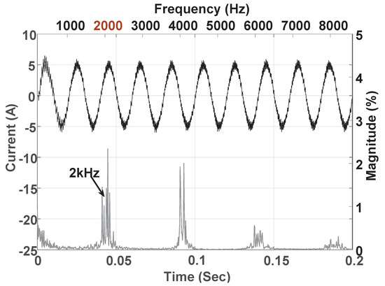 Figure 11. Experimental results of output load current (phase a) with its corresponding spectrum utilizing periodic control (P-CMPC).