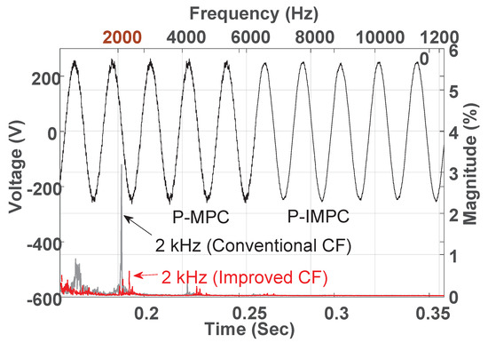 Figure 12. Obtained experimental voltage and spectrum results using the conventional and improved CFs. = 2 kHz, = 60 μF, = 5 mH. - □