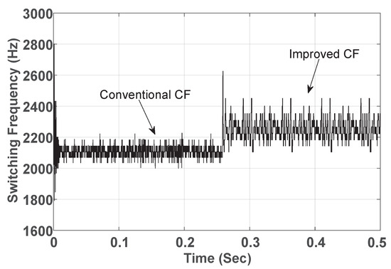 - In Figure 9, the switching frequency fixed behaviour is obtained successfully by the periodic control technique. In case of having no control over the switching frequency, both conventional and improved FCS-MPC have high switching fluctuations. Thus, the output voltage and current harmonics are spread to a wide range of frequencies, as shown in Figure 10.