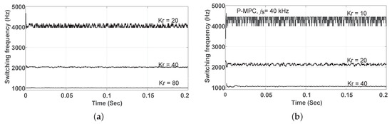 - Figure 15 shows the measured switching frequency in cases where using the P-CMPC and P-IMPC as discussed in Equation (29). It depicts that in P-IMPC, the deviation from the reference is a little higher compared to the conventional P-CMPC, and the reason is that the weighting factors for both tests, in this case, were kept constant. That was to illustrate the effect of using the same weighting factors for both algorithms.
