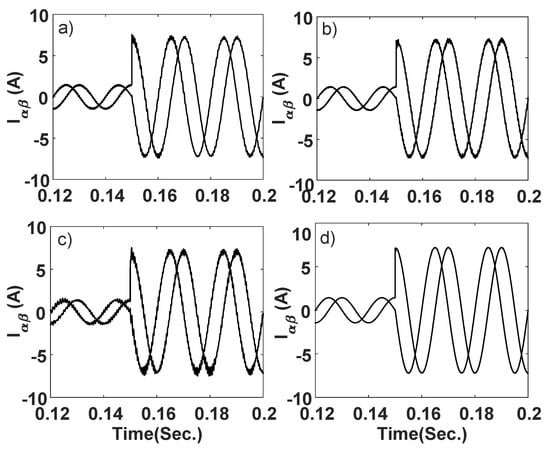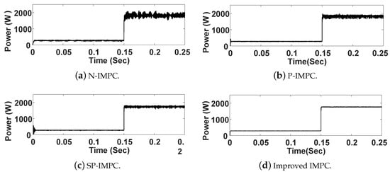 All FCS-MPC algorithms were discussed in this work have been tested in order to observe the dynamic operation in case of load changes. A power change of more than 30% of the total power has occurred suddenly in order to test all controllers. As shown in Figure 17, it can be seen that currents using SP-IMPC, N-IMPC, and P-IMPC still responded to the instant load changes exactly the same as the IMPC. One reason behind this is the accurate design of each CF, which guarantees no conflicts between the several objectives in one CF. Furthermore, Figure 18 and Figure 19 show the power deviation of conventional and improved CFs with/without including the frequency control terms. Due to the ability of the IMPC to better regulate the voltage and current quantities, the power deviation in case of using frequency control terms with IMPC shows promising results.
