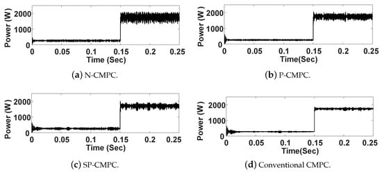 Dynamic response of active power using frequency control methodologies with the conventional CF (CMPC). (a) Notch filter control using the conventional CF (N-CMPC); (b) periodic control using the conventional CF (P-CMPC); (c) simple penalization control using the conventional CF (SP-CMPC); and (d) conventional CF (CMPC).