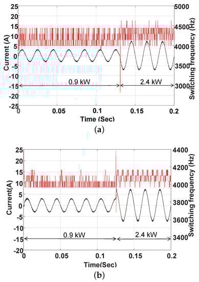 Sampling effect: a comparison between the switching frequency and currents response of the 40 kHz and 80 kHz samplings. (a) A step response from 2.2 kW to 5.2 kW when Ts = 25 μs; and (b) a step response from 2.2 kW to 5.2 kW when Ts = 12.5 μs. (a) Experimental results: the dynamic response for a VSC using a periodic control strategy having a 40 kHz sampling; (b) Simulated dynamic response for VSC using periodic control strategy having an 80 kHz sampling frequency.