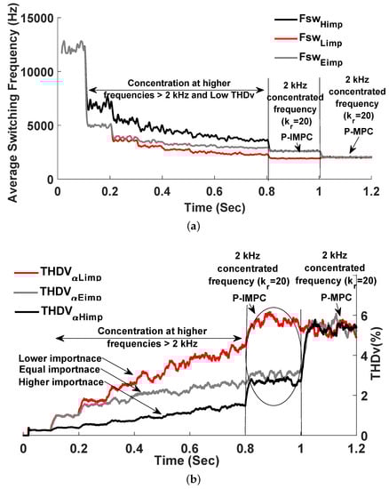 Weighting factors drifting based on the relative importance: average switching frequency and THDv of the for the three criteria; (black line) the derivative term is higher importance than the periodic term; (red line) the derivative term is lower importance than the periodic term; and (grey line) the derivative term is equal importance to the periodic term. (a) Average switching frequency for the three criteria; and (b) THDv of for the three criteria.