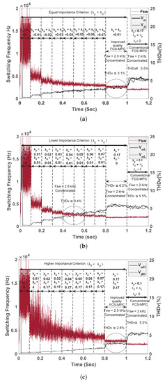 Measured switching frequencies and THDv for the three criteria at 1 kW (a) the drift of the weights, where the derivative weighting factor is equal to the periodic weighting factor ; (b) the drift of the weights, where the derivative weighting factor is lower than the periodic weighting factor ; and (c) the drift of the weights, where the derivative weighting factor is higher than the periodic weighting factor . (a) Equal importance case; (b) Lower importance case; (c) Higher importance case.