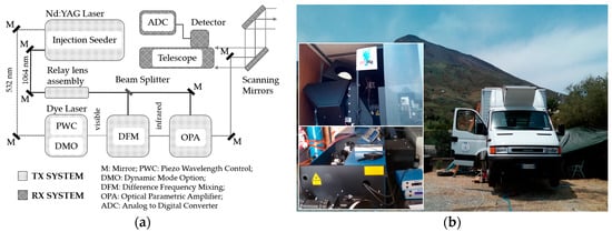(a) Technical scheme of the BILLI DIAL system extrapolated and rearranged from the Figure 2 reported in []); (b) Experimental setup of the system during the Stromboli campaign (the volcano summit is visible above the two inset pictures). The scanning mirrors and the laser system are visible in the top and bottom inset picture, respectively.