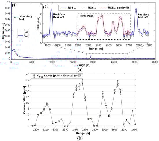 (a) Example of a lidar profile acquired during the Stromboli volcano field campaign on 26 June 2015. (1) Data profiles in the form of signal intensity (arbitrary units, a.u.) vs. range (in meters) cleaned by the noise. (2) Detail of the experimental RCS (Range Corrected Signal) and filtering of the OFF channel using a Savitzky–Golay filter algorithm with 13 points in which the plume peak is visible between two rockfaces in the range interval between 1800 and 2900 m. The laboratory peak in (1) provides the start time of the pulse emission and is due to the reflection of some laser radiation inside the mobile laboratory. The two rockface peaks (2), as their name indicates, are due to pulse backscattering by the rockfaces of Stromboli. Finally, the peaks from 2200 to 2700 m are linked to the backscattering of the laser pulse from the plume. (b) Particulars of the exceedance of in-plume CO2 concentration profile (acquired at 11:27, with an elevation 16.98° and azimuth 237.8°). The quadratic sum of statistical (2%) and systematic (5.5%) uncertainties led us to estimate an overall uncertainty of about 6%.