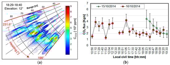(a) An example of a lidar scan in polar coordinates through the plume at an elevation of 12° (15 October 15 2014). The contour lines show isopleths of background-corrected CO2 mixing ratios in the plume (expressed in ppm, the legend is the vertical colored bar), shown as a function of heading and range. (b) Time-series of lidar-derived CO2 fluxes from Pisciarelli obtained from 15 October (afternoon) to 16 October (afternoon), rearranged from Figure 4 reported in []. The timescale for the morning scans on 15 October is shown in green. Each point refers to a particular scan through the plume (time is the onset time of the scan, with each scan lasting 10–20 min) [].