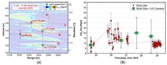 (a) In-plume CO2 concentration map acquired on 26 June 2015 at Stromboli. Carbon dioxide concentration varies as a function of increasing altitude (on the left of the map) and elevation (on the right of the map). The superimposed grey points represent the vertical wind profile retrieved by BILLI in the same dataset. Here, the mean value of the wind velocity was found about 1.3 m/s. The x-axis error bar is the weighted average standard uncertainty of wind velocity, equal to 0.52 m/s. Instead, the error bar on the y-axis represents the altitude halfwidth between adjacent regions (A, B, C, and D) []). This figure has been obtained by combining Figure 4 and Figure 8 reported in []. (b) Time-series of CO2 fluxes from Stromboli volcano from 24 to 29 June 2015, rearranged from Figure 5 reported in []. The BILLI based fluxes (red circles) were obtained using the procedure detailed here [,]. For comparison, independent CO2 flux estimates, obtained by multiplying the in-plume CO2/SO2 ratio (from Multi-GAS) by the SO2 flux (from UV cameras) are also presented (green squares) [].