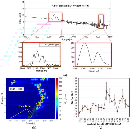 (a) Lidar return at 12° of elevation: two wide and jagged peaks from the volcanic plume are clearly visible; the CO2 profiles inside the volcanic plume are shown in the two red boxes. The uncertainty was equal, respectively, to 6% for the left-side plume peak and 7.5% for the right-side plume peak. (b) Vertical scan (fixed azimuth: 230°) of the volcanic plume (CO2 excess) acquired on 31 July 2016 (12:47 p.m.–1:03 p.m., local civil time). With that fixed azimuth and in the elevation range 7–9°, rockfaces reflect the laser pulse, corresponding to peaks that are not linked to the plume (rockfaces are disentangled from plume because of the narrowness of peaks). (c) Carbon dioxide flux measured at the northeast crater on 31 July 2016 (12:22 p.m.–6:08 p.m., local civil time). The bars show the error in carbon dioxide flux (33%). Please note that the previous figures were extrapolated and rearranged from Figure 2a, Figure 4c, Figure 5, respectively, reported in [].