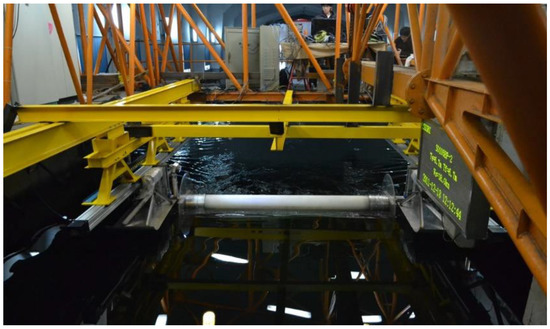 The model tests are carried out at the towing tank located at Shanghai Ship and Shipping Research Institute. The main dimension of this towing tank is 192 m × 10 m × 4.2 m (length × width × depth). The test apparatus were mounted under the towing carriage, which consists of the vertical and horizontal tracks, semi-submerged cylinder and end plate. The semi-submerged cylinder model is made of polypropylene and can be regarded as a smooth rigid cylinder. The hydrodynamic diameter D and length L of the model are respectively 0.25 m and 2 m. The vertical tracks driven by serve motors are employed for adjustment of the height of cylinder to the semi-submerged state. The horizontal track drives the semi-submerged cylinder to oscillate with various amplitudes and periods. The axonometric sketch and the actual apparatus are respectively shown in Figure 1 and Figure 2.
