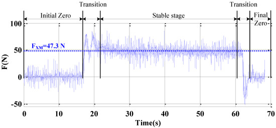 To validate the measurement system and the smoothness of the cylinder, the cylinder was first fully immersed in the water and towed in steady flow. The time history of hydrodynamic force in the IL direction was recorded and shown in Figure 3. The entire time history contains four phases—initial zero, transition, stable stage and finial zero. The mean force value FXM in the stable stage in the IL direction is approximately 47.3 N/m under flow velocity U of 0.4 m/s. The corresponding drag coefficient CD is calculated by,