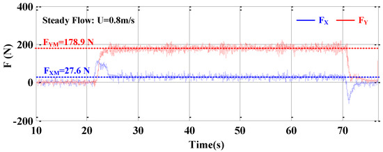As shown in Figure 4, the time history of the hydrodynamic loads on a semi-submerged cylinder under the steady flow velocity of U = 0.8 m/s was presented. The blue and red solid lines respectively represent the hydrodynamic forces in the IL and CF directions. The mean force in the IL direction FXM and mean lift force in the CF direction FYM are 27.6 N and 178.9 N, respectively. A novel phenomenon of an obvious mean downward lift force is witnessed for semi-submerged cylinder and reported by Ren et al. (2019) [19]. This mean lift force is greater than the drag force and should be considered in the real engineering projects.