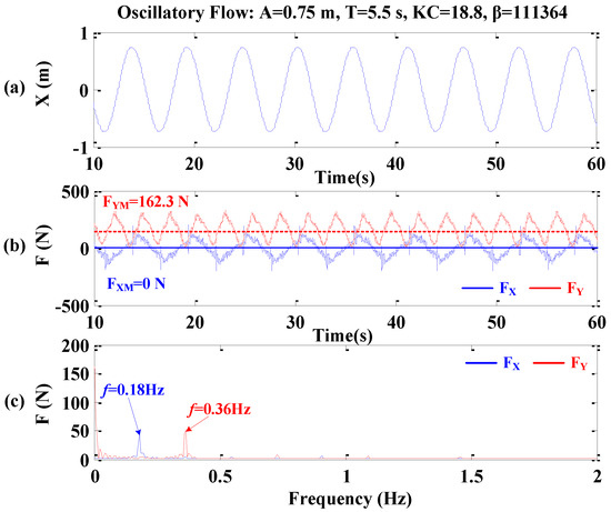 For the hydrodynamic force on semi-submerged cylinder in an oscillatory flow, the time history of these forces in both IL and CF directions for KC = 18.8 and β = 111,364 is shown in Figure 5. Similar to hydrodynamic force on semi-submerged cylinder in steady flow, the mean downward force in the CF direction FYM can be obviously witnessed. The values of FYM were 162.3 N for KC = 18.8 at β = 111,364, while no mean values of the force in the IL direction can be observed. The mean lift force in the CF direction can reach and even exceed the fluctuating force amplitude of hydrodynamic force in the IL direction (FX). The fluctuating components of two forces are in the same magnitudes.