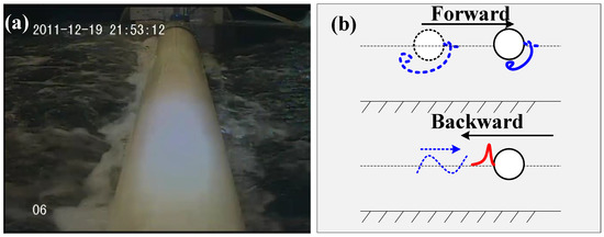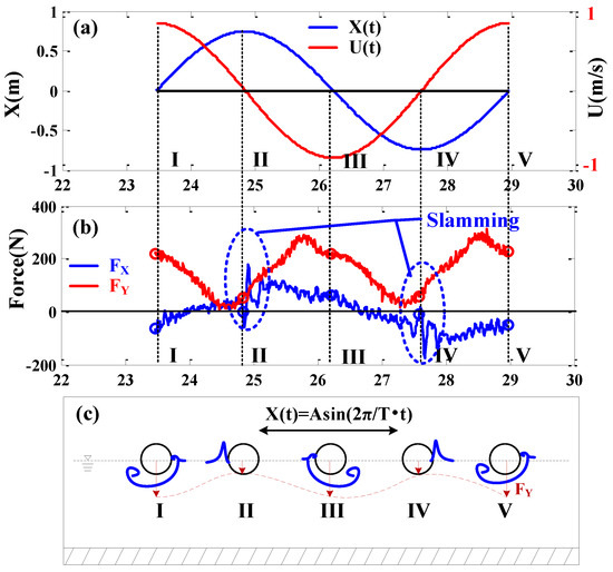 Beyond that, a shock signal of the force in the IL direction appears when the cylinder reverses its motion direction (II, IV). The phenomenon is caused by the “slamming” phenomenon as shown in Figure 6a. Figure 6b shows the developing process sketch of the slamming. When the cylinder move forward, the water attached on the cylinder and exciting wave will be moved in the same direction as the cylinder. As the cylinder reverse its moving direction, the attaching water and exciting wave cannot change their movement direction immediately. The cylinder will strike the exciting wave and attaching water. The water climbs significantly in an instant and results in an impulse force in the IL direction. Slamming will result in high pressure and introduce damage on local structure and subsequent failure of the entire system. Thus, it is necessary to take some considerations to the local structure designs.