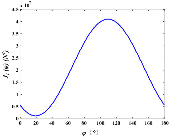 The sum of the squared difference J1(φ) between the predicted and measured fluctuating force versus phase difference under KC = 18.8 at β = 11,364 (A = 0.75 m, T = 5.5 s).