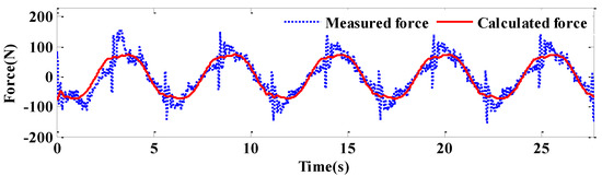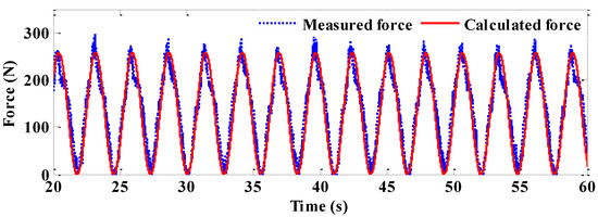 Combining measured hydrodynamic force and forced motion in the IL direction, we can calculate the drag coefficient (CD) and added mass coefficient (Cm) using the method proposed in Section 3. To verify the identified method of hydrodynamic coefficients, the hydrodynamic force is recalculated through Equation (8) by identified drag and added mass coefficient as shown in Figure 10. The blue dashed line and red solid line represent the measured force and calculated force, respectively. The good consistency is witnessed between measured and calculated value. This demonstrates the validity of the identification method for hydrodynamics of semi-submerged cylinder under an oscillatory flow.