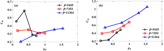 Figure 11 shows the drag and added mass coefficients distribution with KC number under different Stokes number β. The relationship between CD and β is indistinct as shown in Figure 11a. When the KC number is less than 20, the discrete distribution features is very obvious. Therefore, the Stokes number would more greatly affect the drag coefficient at this condition (KC < 20) but does not show a significant influence on drag coefficient under KC > 20. As the value of β increase, the drag coefficient increases under smaller KC number (KC < 20) but decreases under larger KC number (KC > 20). Different from the results of drag coefficients, the distinctive features is found that Cm increase with KC and β number as shown in Figure 11b. For the semi-submerged cylinder, the free surface effects cannot be ignored. Thus, the Froude number will be an important parameter to describe the hydrodynamic coefficients [14,19]. Further, Figure 12 present the drag and added mass coefficient changing with Froude number under the same Stokes number. The drag coefficient in Figure 12a shows the disorderly and irregular characteristics. The relationship between CD and Fr cannot be directly concluded under the same Stokes number. As for the added mass coefficient of semi-submerged cylinder, the positive correlation between Cm versus Fr is also obviously seen under the same β value as shown in Figure 12b. Under the same KC number, it is clear that hydrodynamic coefficients are significantly related to the Froude number as illustrated in Figure 13. When KC < 20, the drag coefficient decreases as Froude number increases. An unexpected phenomenon is observed that the drag coefficient increase linearly with Froude number as KC > 20 as shown in Figure 13a. With the increase of KC number, the relationship of drag coefficient has a significant evolution trend with Froude number, nonlinear decay changing to linear increase. Additionally, the added mass coefficients show a nonlinear (KC < 20) and a linear (KC > 20) increase trend similar to the trend of drag coefficient under KC > 20. The evolution trend from nonlinear to linear uptrend of the added mass coefficient can also be witnessed. From above observation, it can be inferred that using the Froude number and KC number to predict the hydrodynamic coefficient of semi-submerged cylinder in an oscillatory flow is a promising way in engineering project, especially for larger KC number (KC > 20).