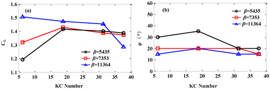 Through the above identified method described in Section 4.2, the lift coefficients and phase angle are determined and summarized in Figure 14, Figure 15 and Figure 16. Figure 14 shows the lift coefficients and phase angle changing with KC number under the same Stokes number. The maximum lift coefficient can reach 1.5, which is even larger than the typical value of drag coefficient for fully submerged cylinder (CD = 1.2) as shown in Figure 14a. Therefore, such large lift force for semi-submerged cylinder cannot be ignored in the related structure design and engineering projects.