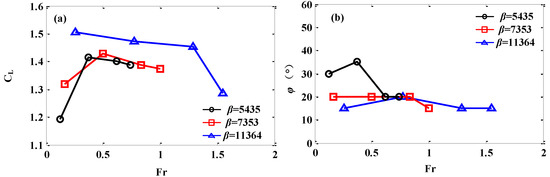 To further investigate the effects of Froude number, Figure 15 illustrates the above two values versus Froude number under the same Stokes number. The stable trend of CL can be seen in the region of Fr ranging from 0.3 to 1.3 as presented in Figure 15a. Relatively dispersed distribution is also found under lower Froude number. Sharp downward trend happens when Fr is around 1.5. In addition, there is slightly obvious phenomenon that the lift coefficient rises with Stokes number when the Froude number is greater than 0.5. Figure 15b shows the phase angle with Froude number under the same Stokes number. More discrete features of the phase distribution can be observed under Fr < 0.5, while stable and slight downtrend appears under Fr > 0.5.
