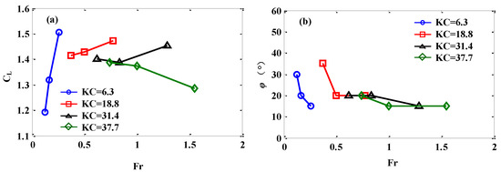 Under the same KC number, the distribution of CL versus Froude number is presented in Figure 16. CL increases with Froude number when KC ≤ 31.4, while decreases with Fr for KC > 31.4. Similar evolutionary phenomenon with drag and added mass coefficient can also be found in lift coefficient. However, there is no linear relationship between CL and Fr. The trend of the CL changes from rapid rise to flat increase and finally shows a downward trend. As for the phase angle, φ decreases with Froude number, especially under smaller KC number (KC ≤ 18.8) shown in Figure 16b. Rapid descend of the phase angle changes to gradual fall with KC number increasing. According to above comparison and analysis, it is more reasonable to use the Froude number and KC number to predict the lift coefficient and phase angle when the Stokes number and Froude number are in the conflict for the semi-submerged cylinder.