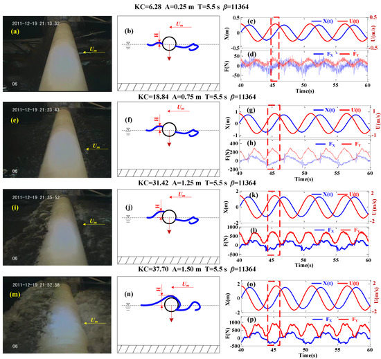 Besides the slamming phenomenon, the overtopping is another tough problem for semi-submerged cylinder in an oscillatory flow [18,19,24]. In Section 4.3, an unexpected drop of the lift coefficient was observed in Figure 14 and Figure 15. To further investigate the hydrodynamic mechanism behind this phenomenon, the water surface waveforms, the corresponding water surface sketches at the maximum forced motion velocity, the time histories of forced motion and hydrodynamic force in both CF and IL directions are compared and shown in Figure 17. Under the same Stokes number, the upstream water level of the cylinder keeps rising with KC number increasing as shown in Figure 17a,e,i,m. To clearly illustrate the water level change, the corresponding sketches are shown in Figure 17b,f,g,n. The symbol “H” represents the upstream water level. When KC = 37.70, the upstream water was over the top of the semi-submerged cylinder, which is termed as “overtopping” phenomenon [18,19]. Different from that in steady flow, the overtopping only happens at around the time of forced motion velocity amplitude. We redefine the phenomenon as “instantaneous overtopping.” Combining with the lift coefficient distribution, we observe that the drop phenomenon happens as the instantaneous overtopping occurs. The reason can be attributed to the changes of the flow field asymmetry. When the overtopping occurs, this asymmetry weakens, which results in a reduction in the lift coefficient. The same phenomenon was also found in the results under the steady flow reported by Ren et al. (2019) [19]. However, the effects of overtopping in an oscillatory flow were not seen in drag and added mass coefficients. Moreover, the drag force and lift force appear relatively high frequency fluctuation in the peak area as shown in red rectangle part of Figure 17c,d,g,h,k,l,o,p. The fluctuation of the hydrodynamic force is also attributed to the instantaneous “overtopping” phenomenon at forced motion velocity amplitude. The extreme surface distortions and water fragmentation caused by the instantaneous “overtopping” phenomenon result in this higher frequency hydrodynamic force. Limited by the quantity of experimental data, more systematic experiments will be conducted to study these effects of instantaneous “overtopping” phenomenon.