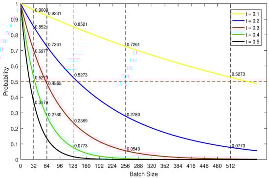 where K is the maximum value of kernel function , is the probability that deviation exceeds t, and t is deviation threshold. According to Equation (6), the deviation between and is closely related to batch size m: is approaching gradually to expectation as sample size increases.