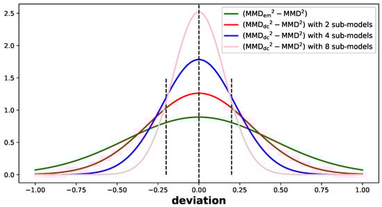 The calculation of can be seen as a type of unbiased estimator used in the B-test [], which is an average over empirical estimate of computed on subsets. According to Equation (5), with batch size equaling to m can be obtained by computing terms of . with batch size equaling to can be obtained by computing terms. By using the divide-and-conquer strategy, is computed using c according to Equation (10). So can be obtained by computing terms. Compared to compute the with batch size equaling to , we avoid the calculation of cross terms when we calculated . The cross terms are the information between different subsets and has been reduced by the division task. has same deviation bound as with batch size equaling to according to []. Therefore, DC-MMD-GANs using can be viewed expanding batch size from m to effectively with less computation amount compared to with batch size equaling to and obtain a tighter deviation bound as is shown in Equation (12) compared to with batch size equaling to m. Under the same , is more accurate than because the deviation t between and is smaller than deviation between and .
