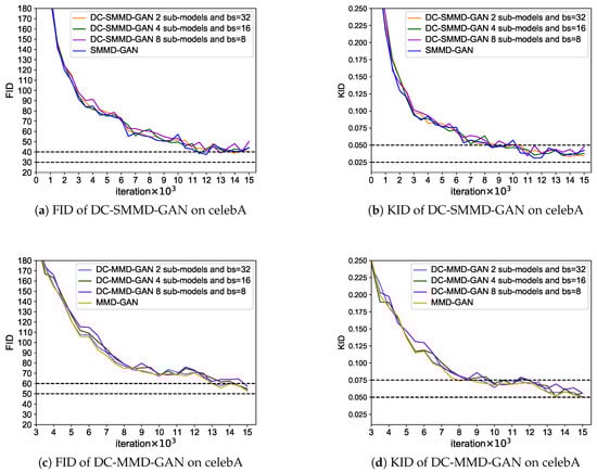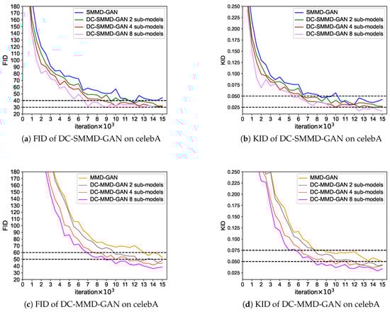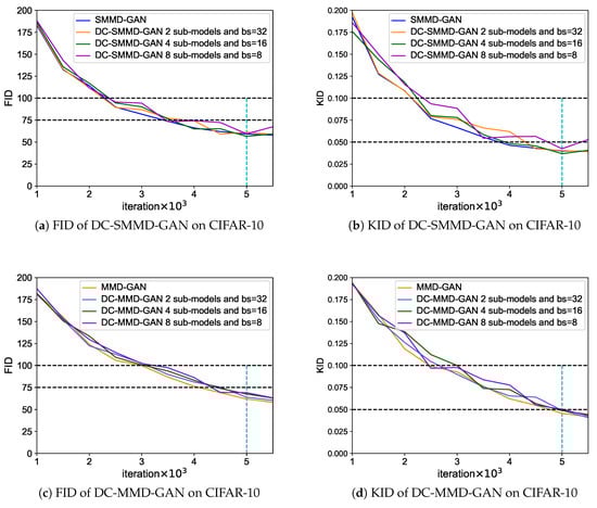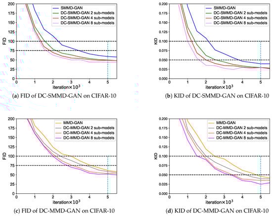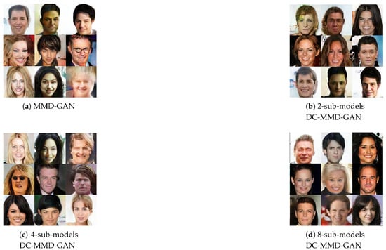 DC-MMD-GANs contain DC-SMMD-GAN and DC-MMD-GAN. We used 2, 4, and 8 sub-models in DC-MMD-GAN and DC-SMMD-GAN. We compared two related GANs models, MMD-GAN [,] and Scaled MMD-GAN (SMMD-GAN) [].