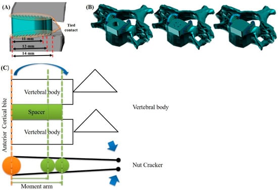 Then, each meshed spacer model was inserted into the C5–6 disc without plate fixation in the previously constructed, intact cervical FEM. The spacers used for modeling were 11, 12, or 14 mm in length, had 6° of lordotic angle, and were 7 mm in height, which best fit the vertebral anatomy at the C5–6 level of the cervical model used in this study. The material properties of the allograft spacers (cortical bone, elastic modulus (E) = 18,200 MPa, Poisson’s ratio (v) = 0.38; cancellous bone, E = 389 MPa, (v) = 0.3) were measured on a donor femur according to previous research [24,25]. The devices were designed to be implanted via an anterior surgical approach, as recommended by the manufacturer. By simulating this surgical procedure [26], the anterior longitudinal ligament, the superior and inferior endplates, and the anterior and posterior parts of the annulus fibrosus were excised. Then, the spacers were positioned at the anterior margin of the vertebral body (Figure 1 and Figure 2). Because our model aimed to simulate biomechanical behavior after bony fusion, specific corresponding constraint conditions were set up, especially at the bone-implant interface. In this study, interface behavior was accomplished through a “tie” contact condition, which enabled the allograft spacer and vertebrae to be bonded together permanently with full constraint.