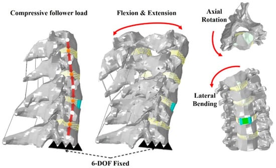 A compressive follower load of 73.6 N was considered to approximate the head weight and local muscle stabilization during daily activity (Figure 2) [14]. A hybrid protocol was used to predict range of motion (ROM) at the surgical site and adjacent levels [28].