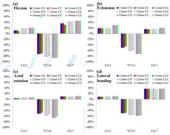 The validated ROM of our intact FEM model was within the acceptable range, compared with cadaver studies [29,30] Upon flexion, the ROM at C4–5 was increased in all spacer models, compared with that in the intact model. The ROM of C5–6 (fused segment) was significantly decreased in all spacer models (Figure 3). Upon extension, when compared with the intact model, the ROM at the C4–5 and C6–7 segments was increased in all spacer models. The ROM of C5–6 was significantly decreased in all spacer models. In axial rotation and lateral bending, when compared with the intact model, the ROM at the C4–5 and C6–7 segments was increased in all spacer models. The ROM of C5–6 was significantly decreased in all spacer models.