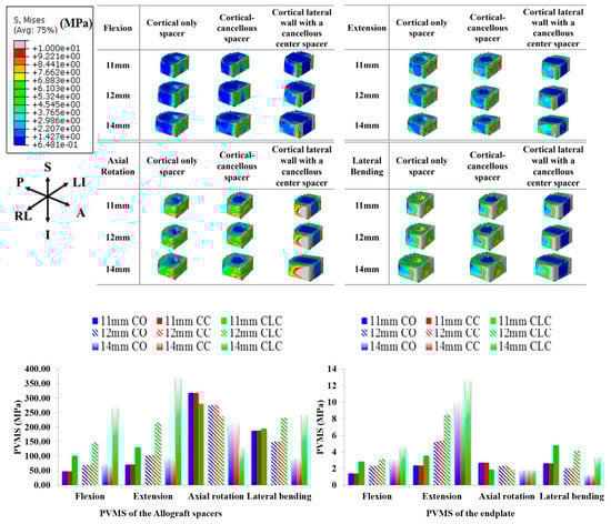 In flexion motion, the risk of allograft spacer subsidence was lowest for 11 mm CO and CC spacers (PVMS, 1.41 MPa; 8.7%) and highest for the 14 mm CLC spacer (PVMS, 4.58 MPa; 28.1%). The subsidence risk was highest for the 14 mm CLC spacer (PVMS: 12.71 MPa, 78.0%) in extension, 11 mm CO and CC spacers (PVMS: 2.71 MPa, 16.6%) in axial rotation, and the 11 mm CLC spacers (PVMS 4.81 MPa, 29.5%) in lateral bending. Subsidence risk was lowest for the 11 mm CO and CC spacers (PVMS: 2.39 MPa, 14.7%) in extension, the 14 mm CO spacer (PVMS: 1.76 MPa, 10.8%) in axial rotation, and the 14 mm CO and CC spacers (PVMS: 1.13 MPa, 6.9%) in lateral bending.