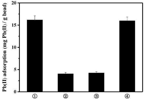 Pb(II) adsorption onto bare bead (mg Pb(II)/g bead): ① Dynabeads® M-270 Carboxylic Acid; ② AccuBeadTM COOH magnetic bead; ③ Cytodiagnostic ZeptoTM Mag Carboxyl Microspheres; and ④ BcMagTM long-arm carboxy-terminated magnetic bead.