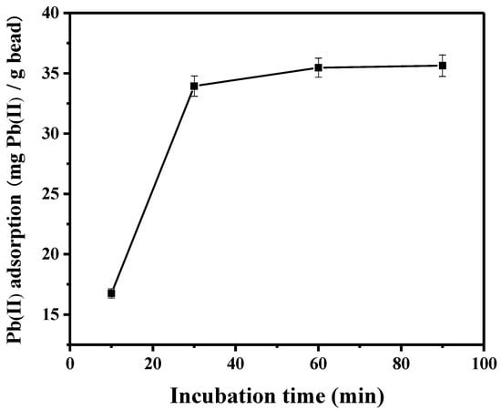 To determine the contact time for lead adsorption, the time profile of lead adsorption onto the peptide-linked (TNTLSNN) bead was monitored, and the results are shown in Figure 2. A contact time within approximately 30 min was required for the peptide bead to be saturated with lead. The increase in lead adsorption was not significant after 1 h, so the time for each of the following adsorption experiments was determined to be 1 h, if not specifically mentioned otherwise. Previous research has shown that the experimental pH can affect the adsorptive uptake of lead ion [,,]. For example, lead can precipitate at pH values equal to or greater than 7, due to the formation of Pb(OH)2 in the solution. Meanwhile, the extent of protonation from sorbent materials interacting electrostatically with Pb(II) ion is determined by the solution pH. The adsorptive uptake of lead decreased at lower pH due to the protonation of sorbents. For the polymeric adsorbent [], the adsorption in distilled water led to the highest adsorption amount of Pb(II) ion. In this study, the pH effect was not examined in detail (pH around 5–6 provided similar results; data not shown). Each metal nitrate was solubilized in distilled water without any further pH adjustment.
