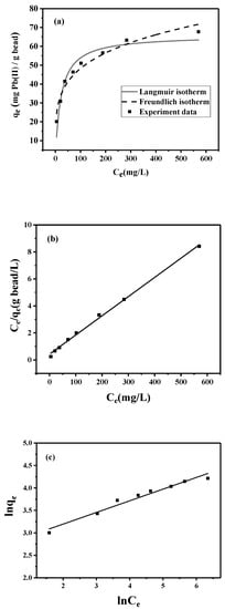 Adsorption isotherms of lead onto peptide bead: (a) nonlinear fitting by Langmuir and Freundlich isotherms; (b) linear Langmuir isotherm; and (c) linear Freundlich isotherm.