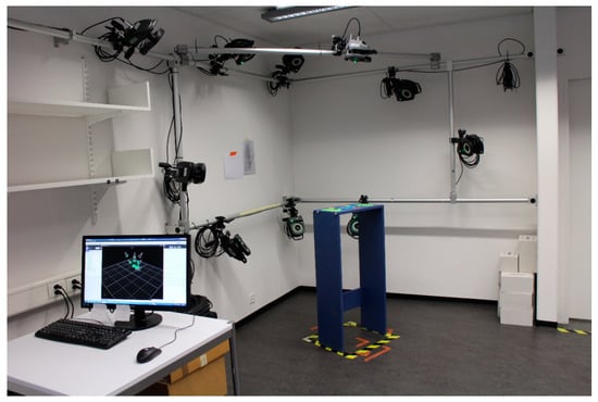 Data was collected with a VICON® motion capture system consisting of eleven infrared cameras, as shown in Figure 1. This corresponds to the number of cameras available to our laboratory and allows good marker visibility in the hand-specific setup. The demonstrated computational model was developed with MATLAB (R2016a, 64-bit, MathWorks, Natick, Massachusetts USA).