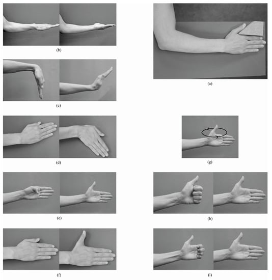 The measurement started with a static recording, displayed in Figure 2a, to define the neutral reference joint position. It was executed in a seated position so that the shoulder was at the same height as the elbow when placing the forearm flat on the testing table. The elbow was kept in 90° of flexion and a 40°-angled wedge was enclosed by the thumb and index finger, to ensure a consistent thumb position relative to the hand. A set of functional, isolated movement tasks for the forearm, wrist, thumb and the fingers was then performed, aiming to measure the maximal ROM, as shown in Figure 2b–i.